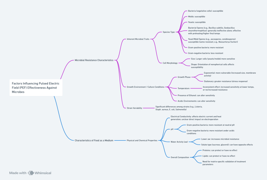 The image below summarizes the factors (described in more detail below) influencing the effectiveness of PEF in microbial inactivation. Click on the image to enlarge it for easier reading: