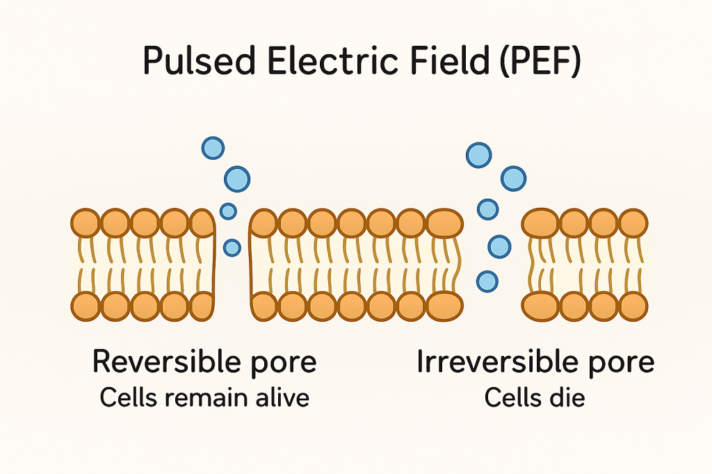Pulsed Electric Field (PEF) processing utilizes electroporation to alter cell membranes, specifically by creating transient pores or channels in the lipid bilayer. This process, involves exposing cells to short, high-voltage pulses of electricity, leading to an increase in cell membrane permeability. Depending on the intensity and duration of treatment, we can create either: