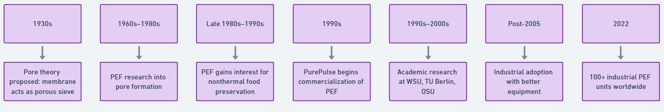 Pulsed Electric Field (PEF) technology, researched since the 1960s, gained momentum in food processing in the late 1980s–1990s due to demand for nonthermal preservation methods. Early commercialization efforts were led by PurePulse Technologies, followed by significant academic research at institutions like Washington State University (WSU), TU Berlin, and Ohio State University. PEF showed promise for microbial inactivation and enhancing mass transfer in food processing. Industrial adoption increased after 2005 with better equipment. EU-funded projects and global collaborations, such as COST Action TD1104 and ISEBTT, further advanced PEF applications (Raso et al., 2022).