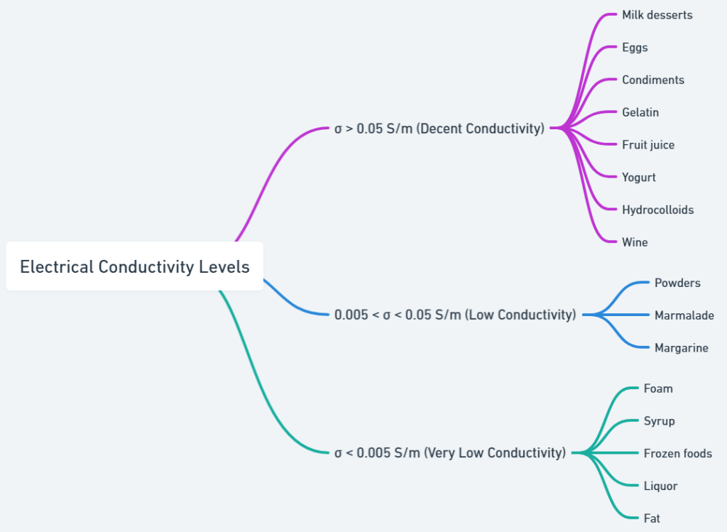 - σ > 0.05 S/m: These materials exhibit relatively good conductivity. Examples include milk-based desserts, eggs, condiments, gelatin, fruit juices, yogurt, hydrocolloids, wine, and similar items.