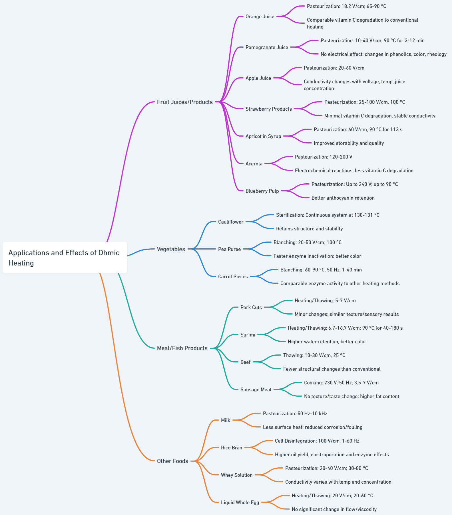 Recognized as a smart and emerging technology, ohmic heating has a wide range of current and potential applications. However, extensive research is still needed to fully understand the post-treatment effects. Future studies should focus on changes in flow dynamics, electrical behavior, and key food properties like conductivity, rheology, and particle size.